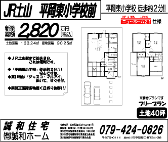 JR 土山 平岡東小学校前 JR土山駅まで徒歩8分。これは便利です。 『平岡東小学校』。徒歩約2分!!!。安心ですね。 お買い物は『ジャスコ・マルアイ』さん。歩いてすぐそば。 東側正面障害物無く日当たり抜群!! 〜フリープラン〜(税込) 土地40坪! ※参考プラン例です 総額 2,820万円(税込)