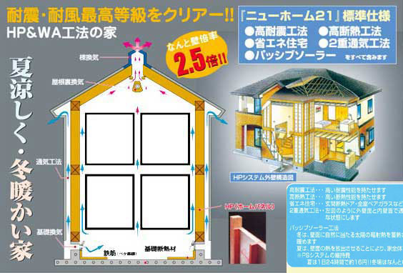 それは快適で安全でかつ経済性を大切にすること・・・私共はそのテーマを徹底的に追求した建物を 今までの在来工法並みの価格でご提供させていただける家を造り出しました。 その名は『ニューホーム21』です。 1棟の中になんと高耐震工法・高断熱工法・パッシブソーラー工法・ 省エネ住宅・2重通気工法 に 含まれる機能をすべて標準装備(別途費用不要)しております。 これだけの機能をすべて他社で装備するとなると、目を覆いたくなるような金額になってしまいます。 ですが、当社は独自の企業努力により圧倒的にお求め安い金額で実現しました。 しかも、阪神大震災以降、特に住宅に対する強度への関心が一層高まる中、『ニューホーム21」は 住宅性能表示基準の耐震等級及び耐風等級(構造躯体の倒壊及び損傷等の防止)の 等級でも最高級をクリアーしております。 壁面倍率では2.5倍という驚異的な数値!積雪などの垂直加重に強い柱構造と、地震や台風など 水平加重に強い面構造の長所を あわせ持つ『ニューホーム21』は万一の災害時に粘り強さをいかんなく発揮! 快適性・及び経済性においては『基礎換気・屋根裏換気・棟換気』を可能することにより、夏は基礎から この度、K様邸を上棟いたしまして下記のようなお手紙を頂戴致しました。 同じ家を建てるなら、ご家族皆様が一年中快適に過ごせ、そして、建物強度等級でも |